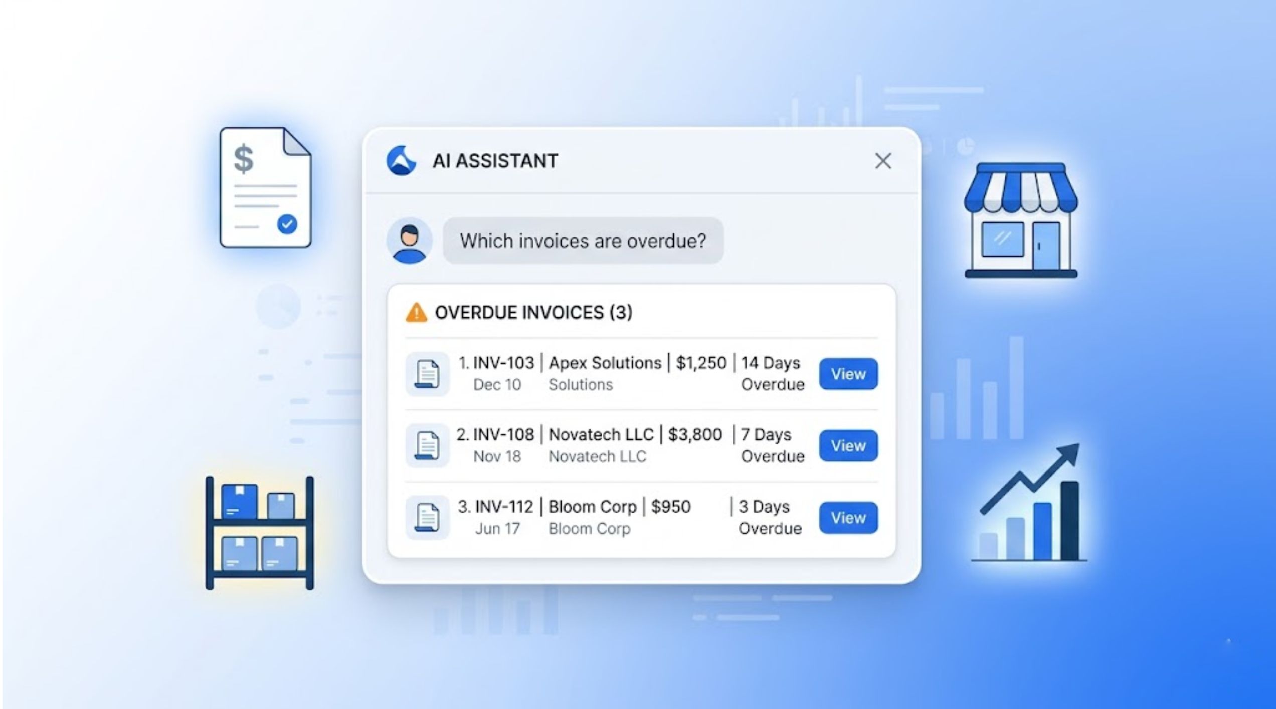 - Type any question about your invoices, inventory, or financials